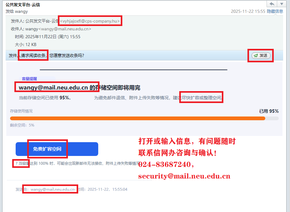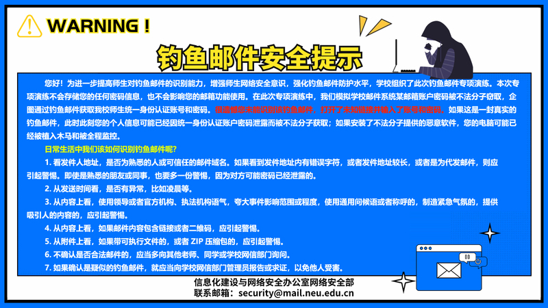 以下图片为近期钓鱼邮件截图,该钓鱼邮件已被我校邮件系统标注为“垃圾邮件”。