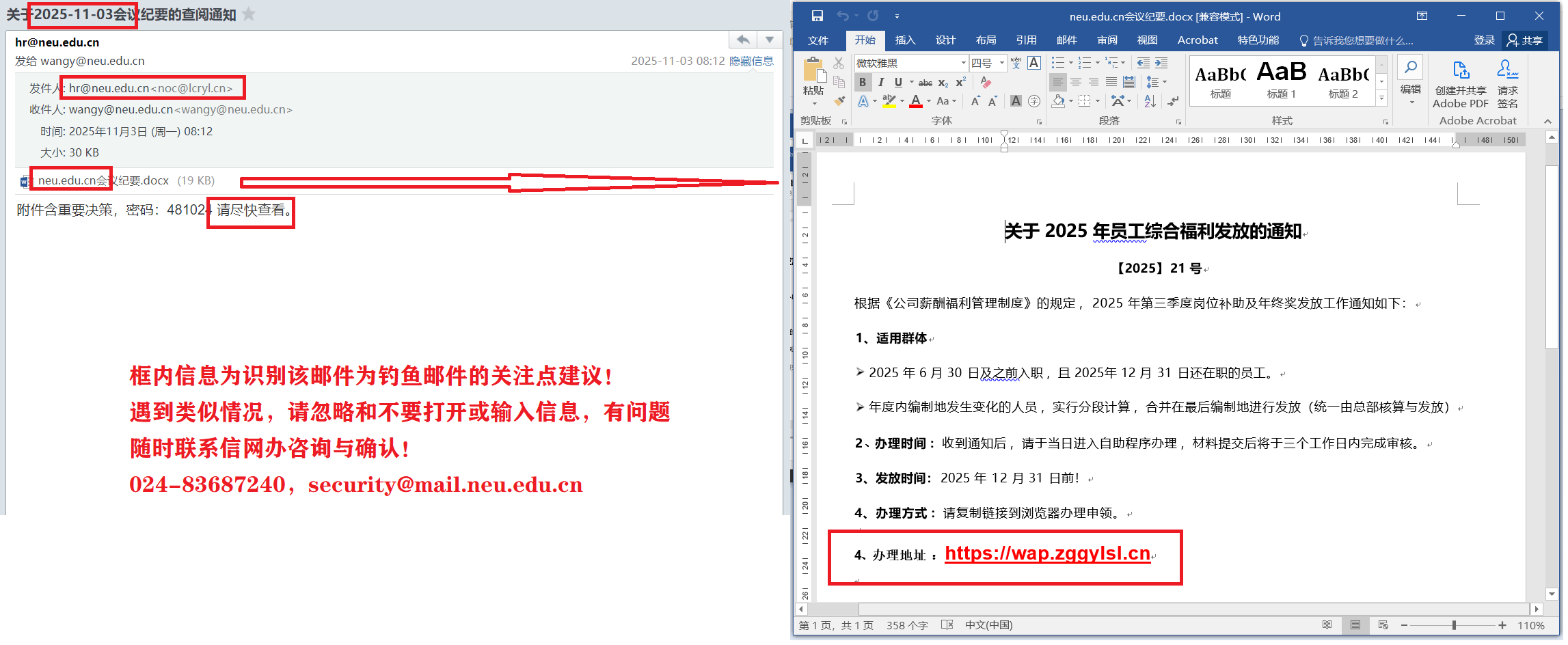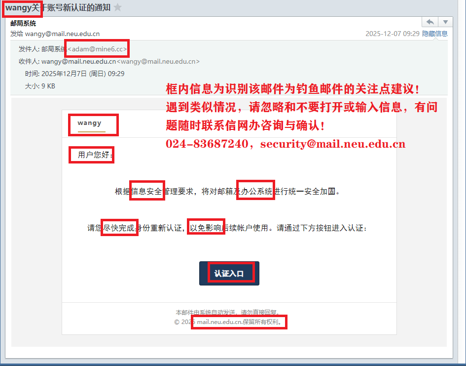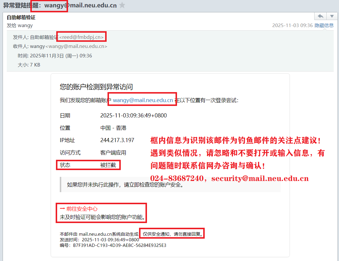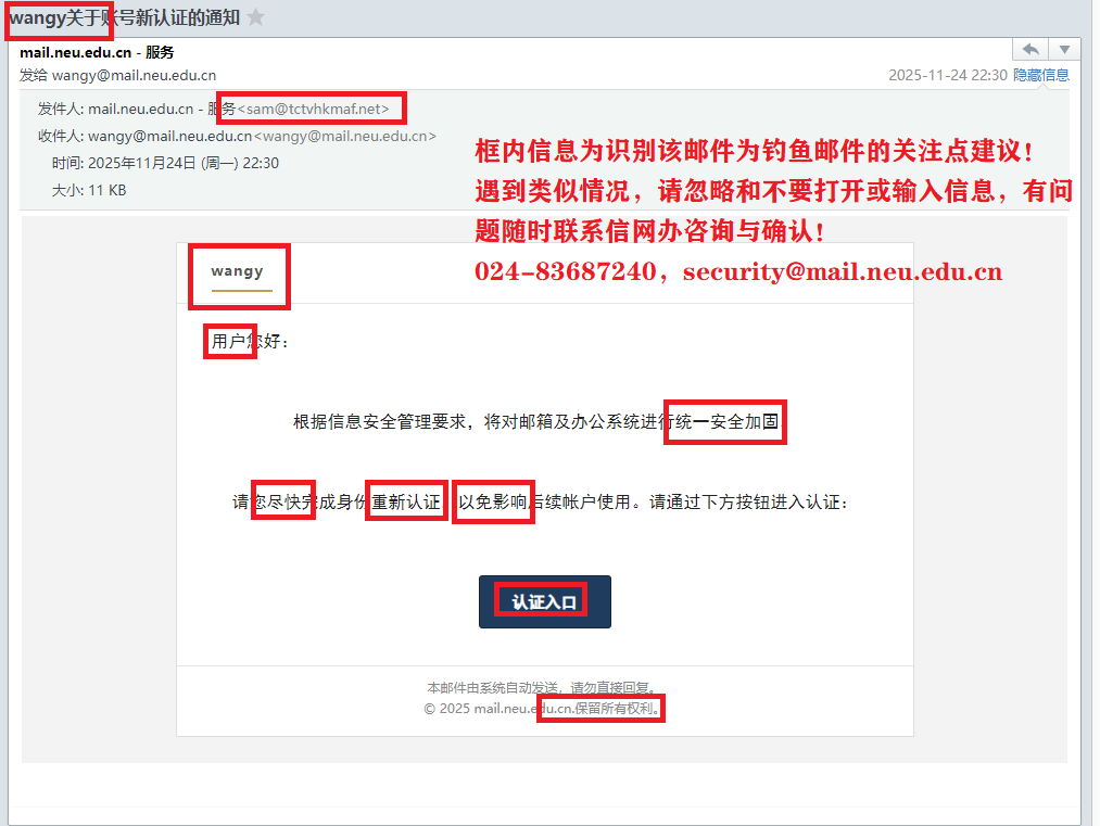 红色框为识别其为钓鱼邮件关注点,近期此类邮件频繁,模仿和贴近实际的水平在提升,如错误点击后跳转到用于获取密码的页面!
